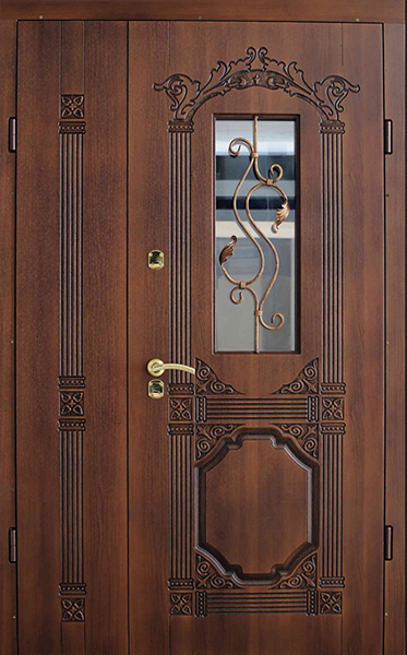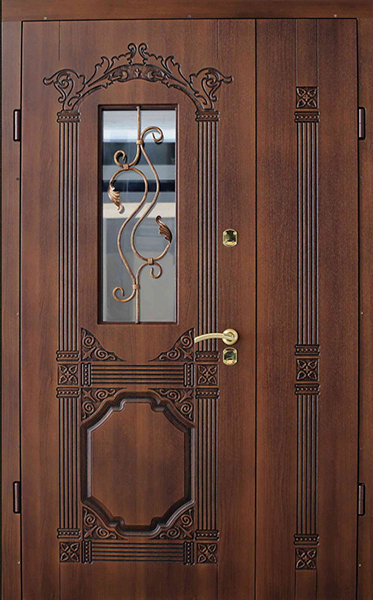 Уличная двухстворчатая дверь со стеклом и кованой решеткой №26 — это не только надежная защита для вашего дома, но и элемент, который подчеркнет его стиль и индивидуальность. Внешняя отделка из МДФ с ПВХ обеспечивает долговечность, устойчивость к внешним воздействиям и сохранение эстетического вида на долгое время. Добавление кованой решетки и стеклопакета придает двери элегантности, а также улучшает светопропускание, создавая комфортное освещение в вашем помещении. Уличная двухстворчатая дверь со стеклом и кованой решеткой №26 от производителя: быстрое изготовление и монтаж в Хотьково, индивидуальные размеры, широкий выбор материалов и фурнитуры, официальная гарантия до 10 лет.